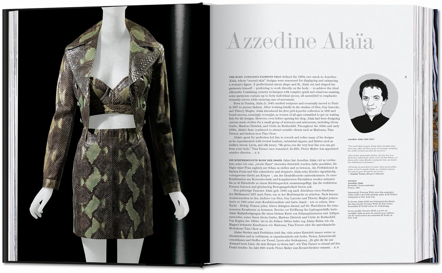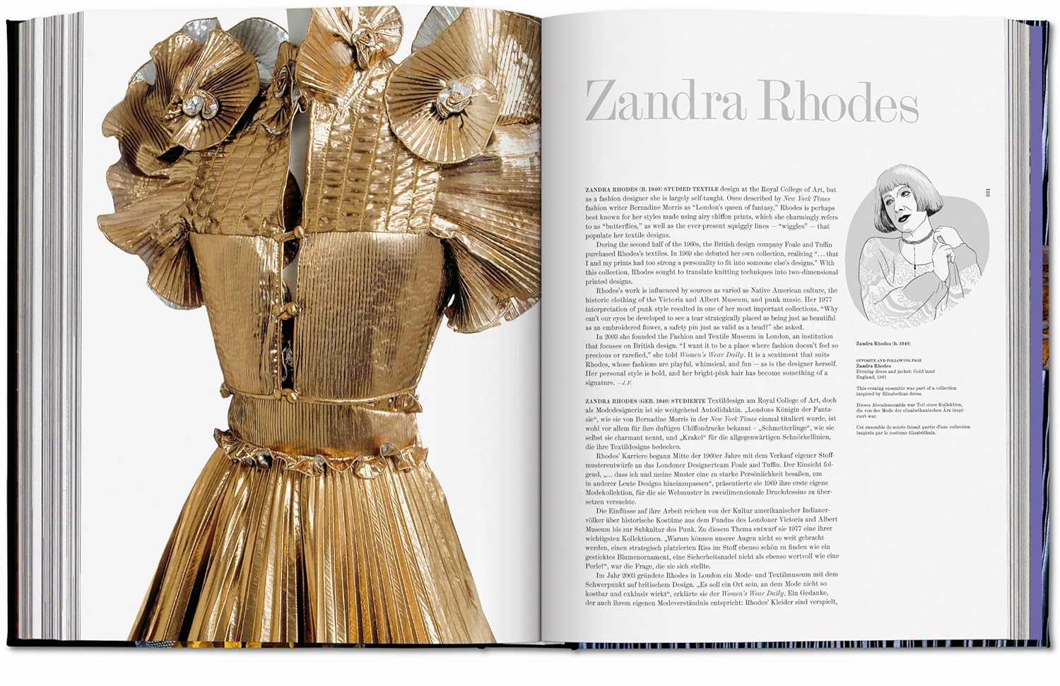 Una delle caratteristiche principali di questa edizione è il ricco corredo iconografico: oltre 500 capi d’abbigliamento sono fotografati con grande cura e attenzione ai dettagli. Ogni pezzo è scelto non solo per la sua bellezza, ma anche per il suo valore rappresentativo. La varietà dei materiali e dei design è sorprendente, spaziando da eleganti abiti da sera ricamati in velluto a siluette minimaliste influenzate dall’opera di Mondrian.