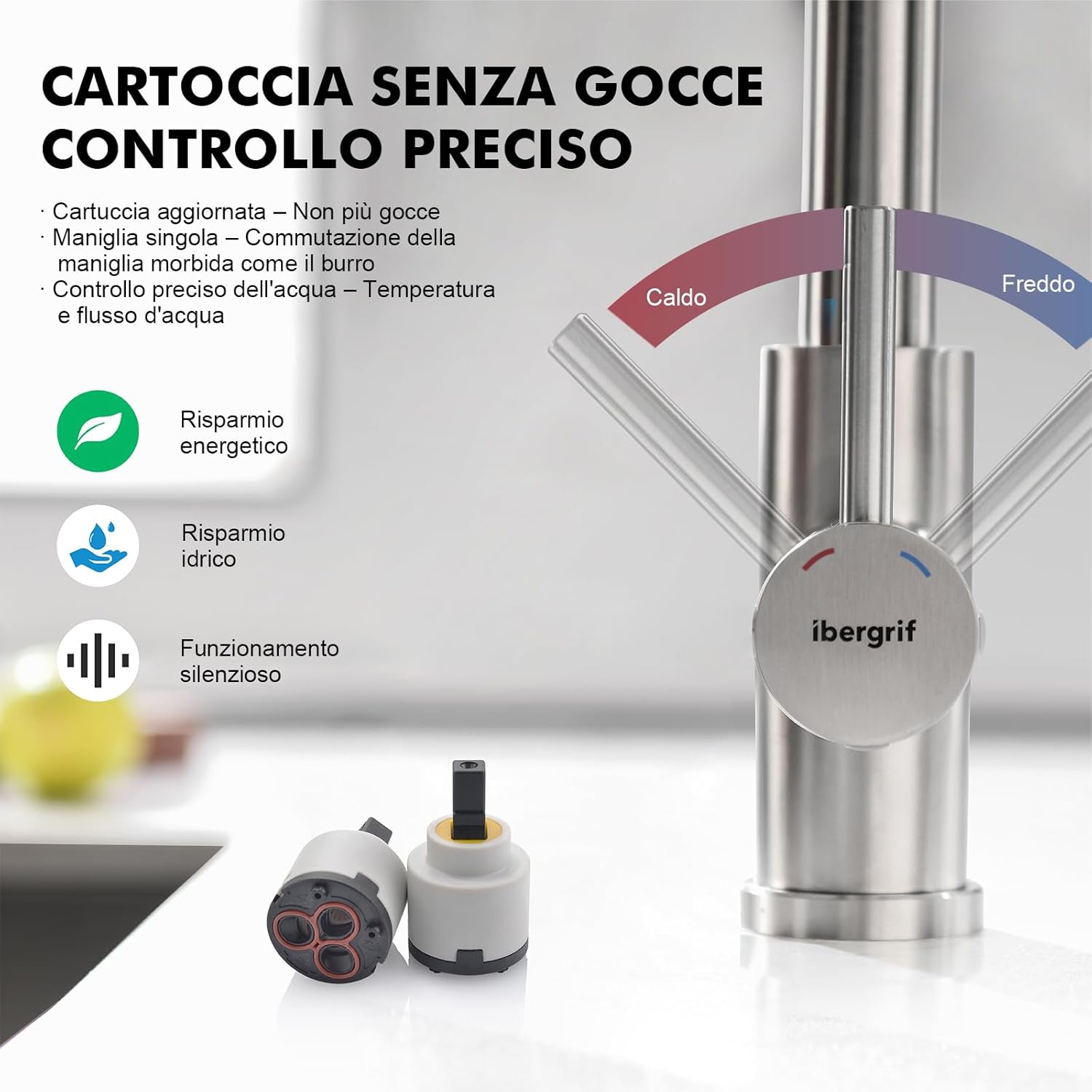 Crafted from premium stainless steel, the Ibergrif tap is designed to endure the daily hustle of a modern kitchen. The brushed nickel finish is not only appealing but also resistant to rust and scratching, ensuring that your faucet maintains its elegant look over time. Additionally, the internal PEX pipes guarantee a lead-free water transport system, ensuring your drinking water remains safe and free from contaminants.
