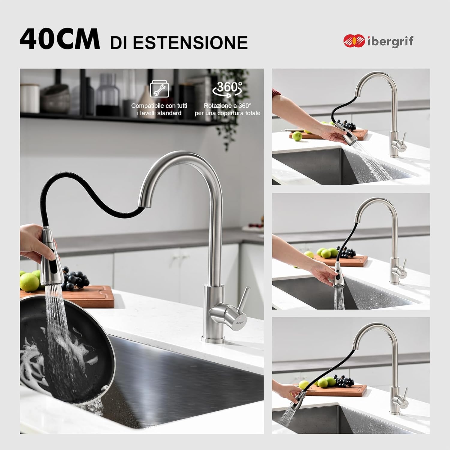 Why Choose Ibergrif Kitchen Sink Tap, Kitchen Mixer Tap with Pull-Out Shower, High Pressure Kitchen Tap Stainless Steel 360° Swivelling Single Lever (M22137)