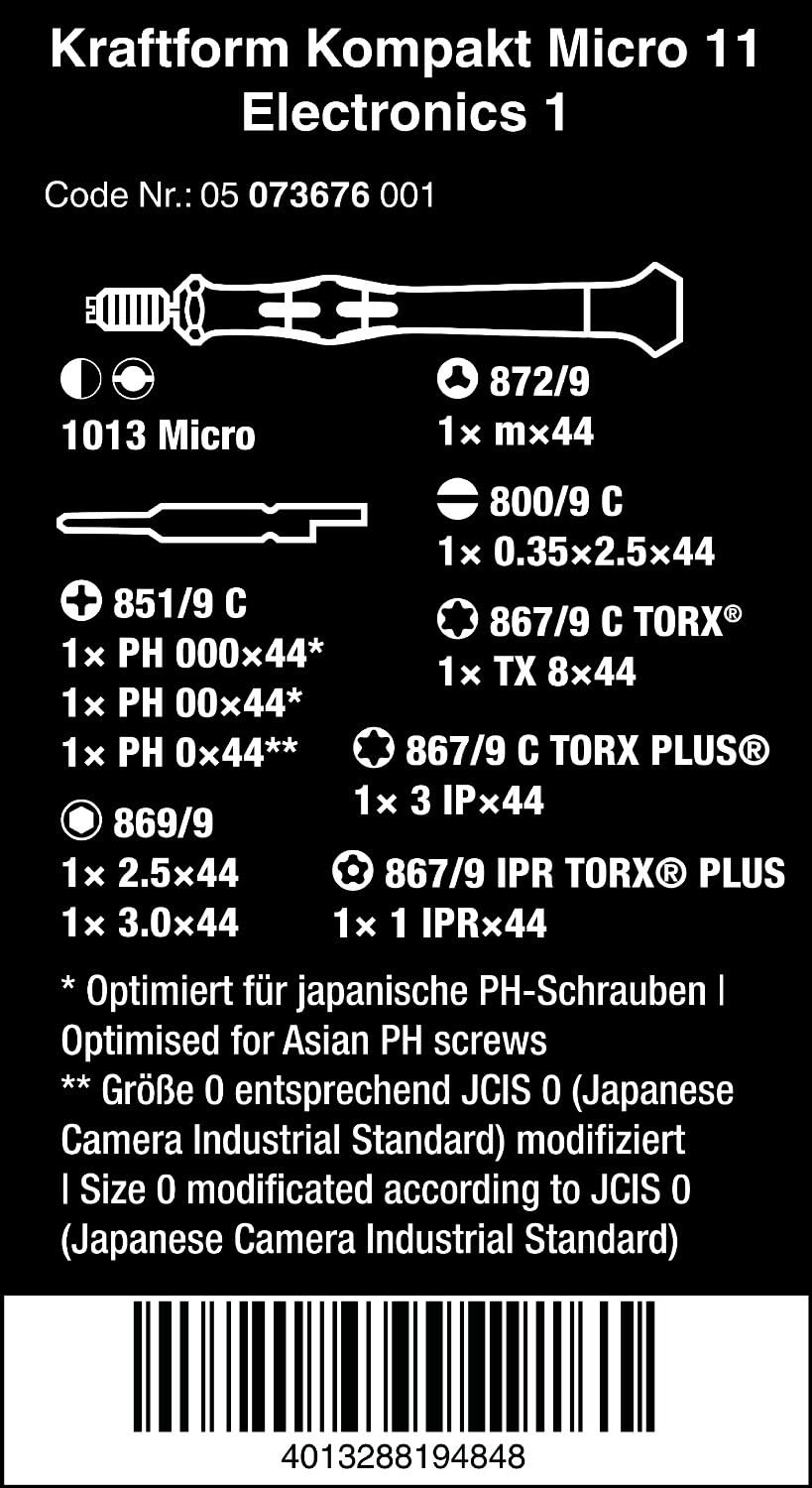 The Kraftform Kompakt Micro 11 set consists of a well-engineered selection of screwdrivers tailored primarily for electronic devices. The set includes: